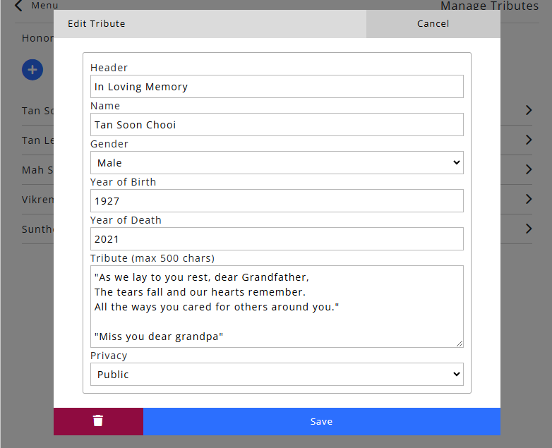 To edit a previously created Tribute, double-click on the selected Tribute record.