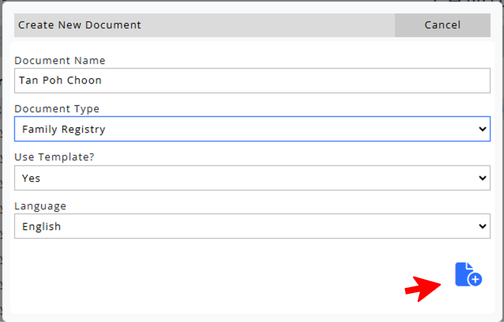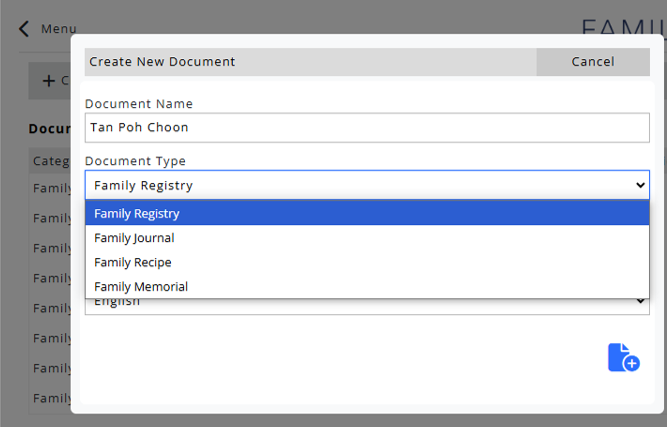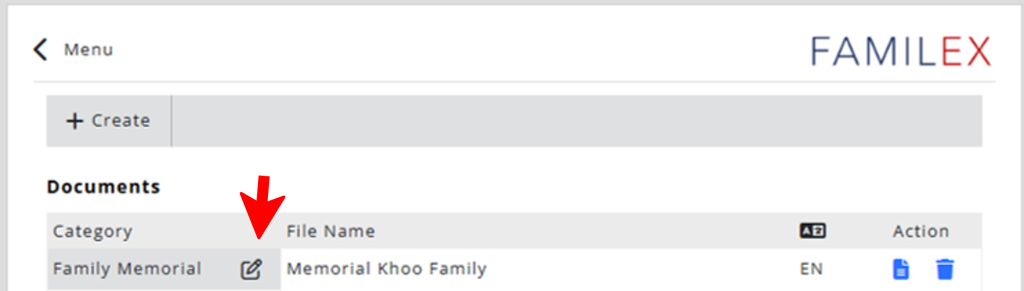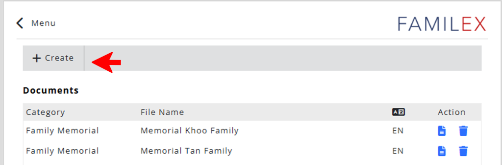 To create a new Familex document, click on the Create button.