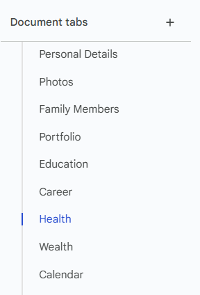 The Familex Registry template is made up of 15 sections. You can use the tabs/quick links to browse and navigate to each section.