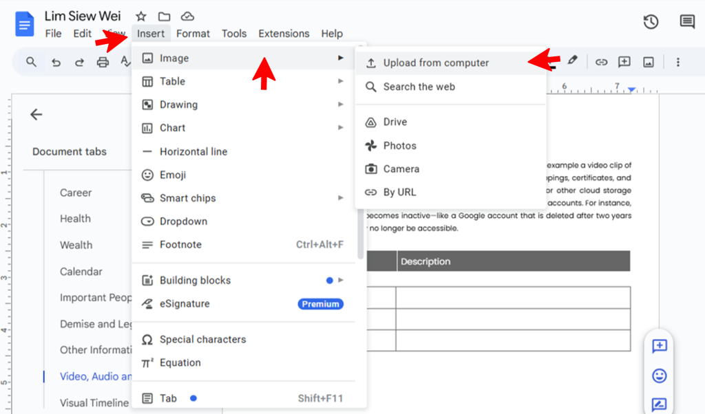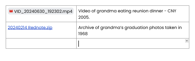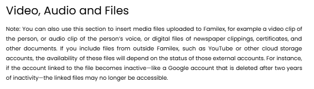 You CANNOT directly embed videos, audios or other file formats (zip, pdf) into the document. Please first upload these files to Familex using the Media feature.