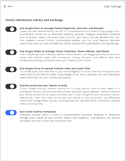 Currently, you can only modify (Turn On or Turn Off) the option “Start with Familex Templates”.