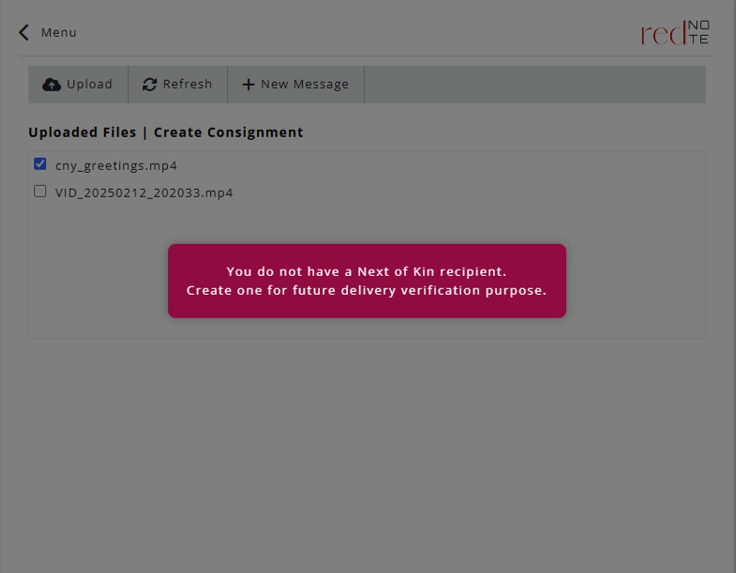 The Manual Consignment feature allows users to create Rednote consignments by manually selecting uploaded videos, recipients, delivery triggers, and verification conditions through the Rednote User Portal. This ensures that specific messages are delivered according to the user’s preferences.