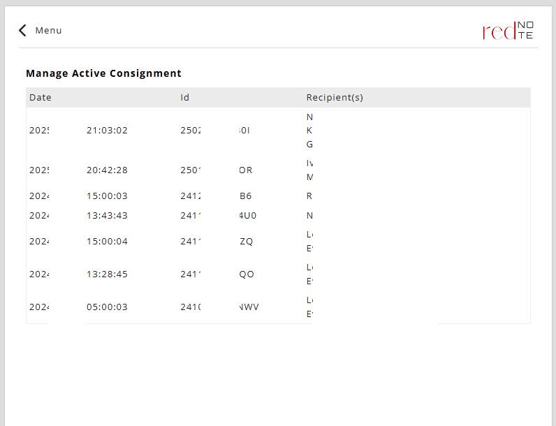 The Rednote Outbox is where users can manage all their active consignments. It serves as a central hub for tracking and controlling consignment deliveries.