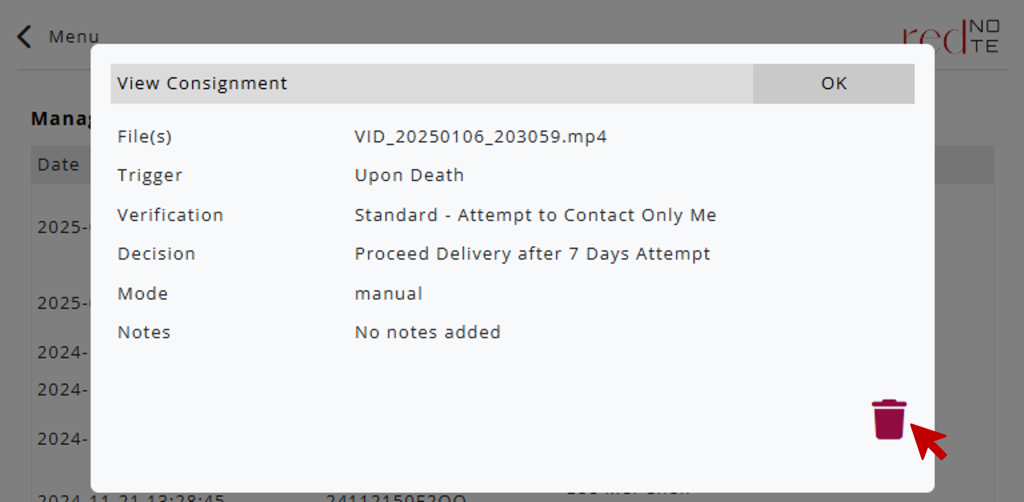 Once a consignment is deleted, the entire record, along with all associated encrypted video files, will be permanently destroyed.